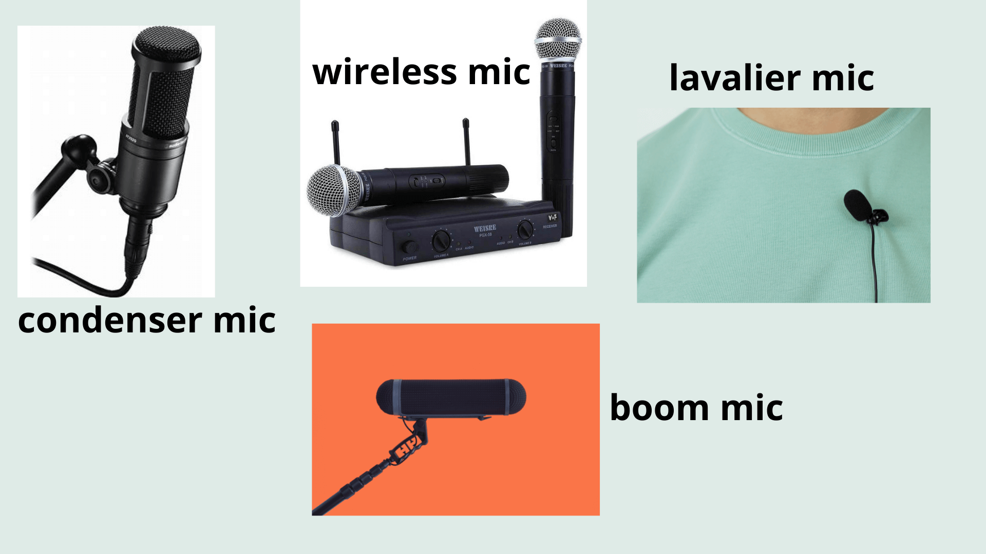 Wireless Mics (aka radio mics) - broadcasts the signal from the microphone to a small receiver which in turn is connected to an audio mixer